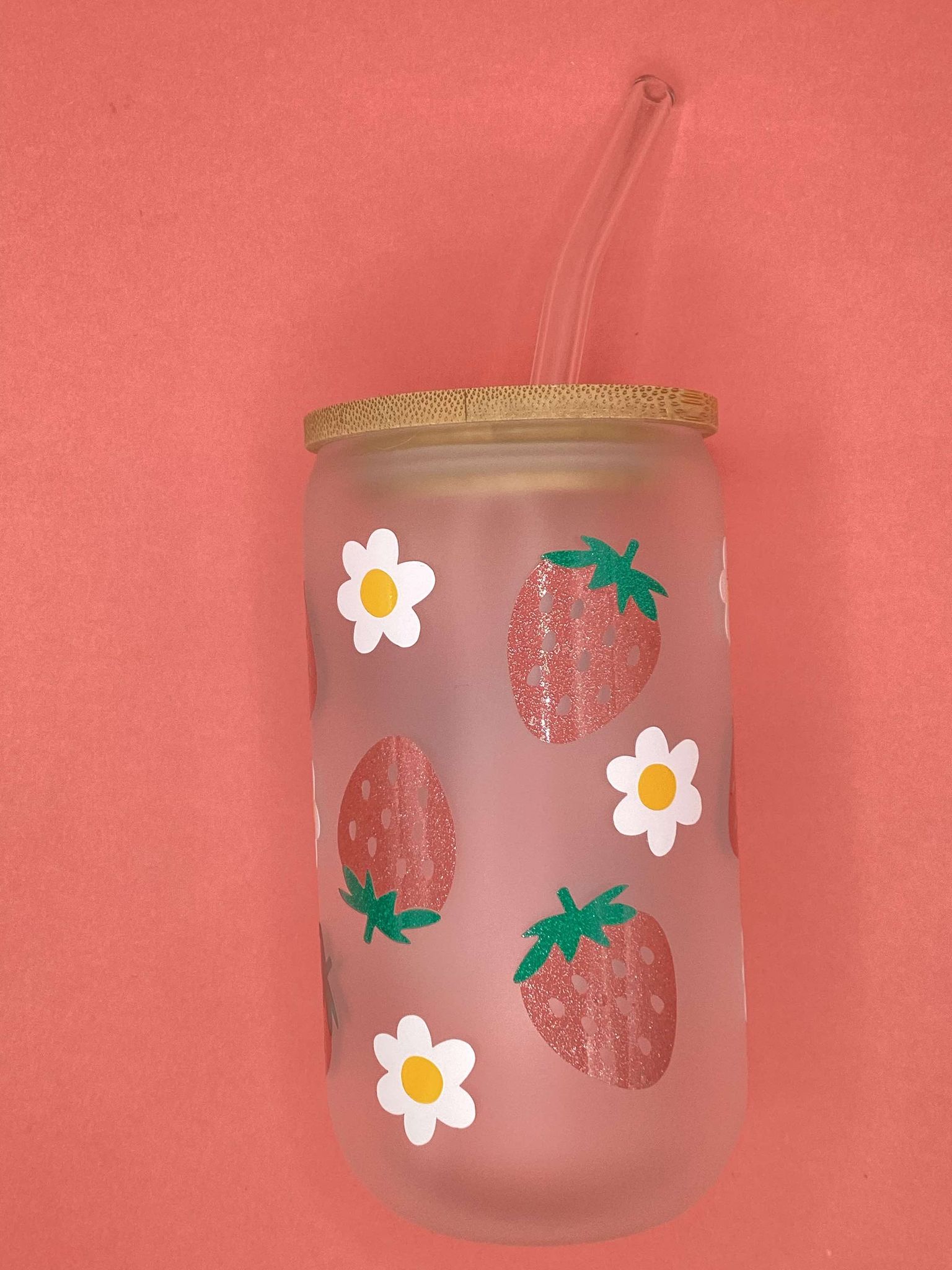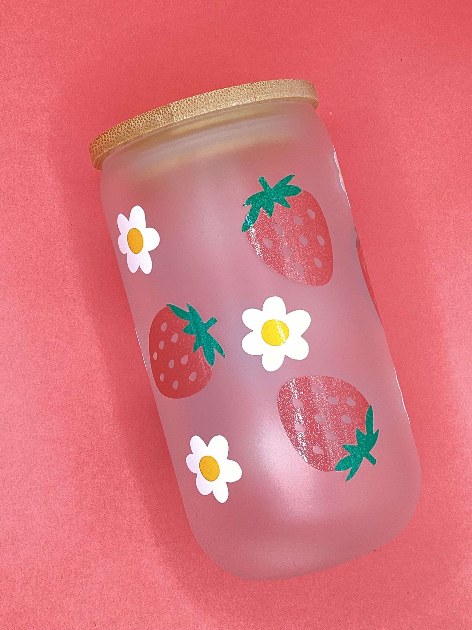 This strawberry design is made using PSV that is meant to be dishwasher safe, but handwashing may preserve the glass for longer. The frosted glass can handle hot and cold drinks.